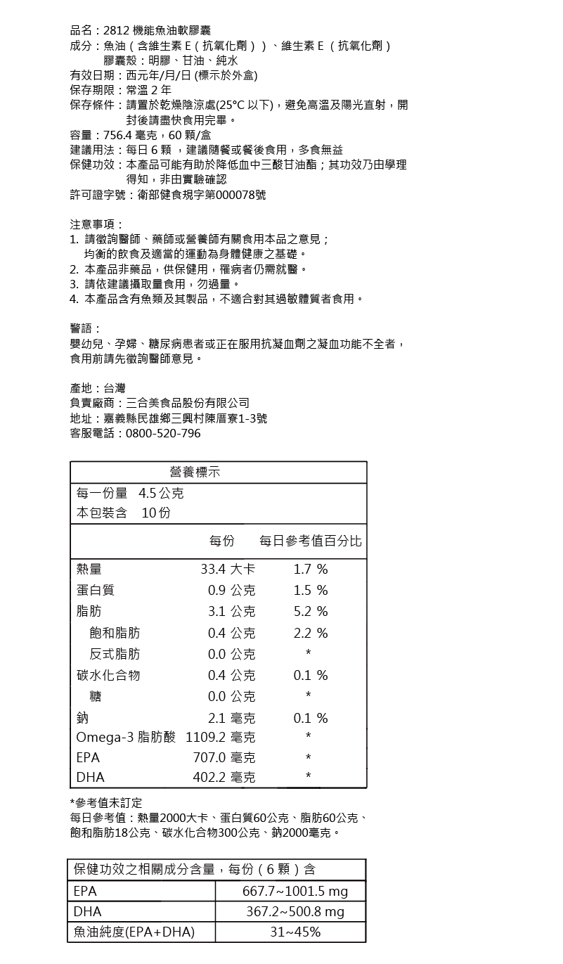 成分:魚油(含維生素 E(抗氧化劑))、維生素 E (抗氧化劑)