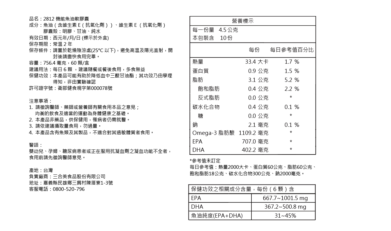 保健功效:本產品可能有助於降低血中三酸甘油酯;其功效乃由學理得知,非由實驗確認