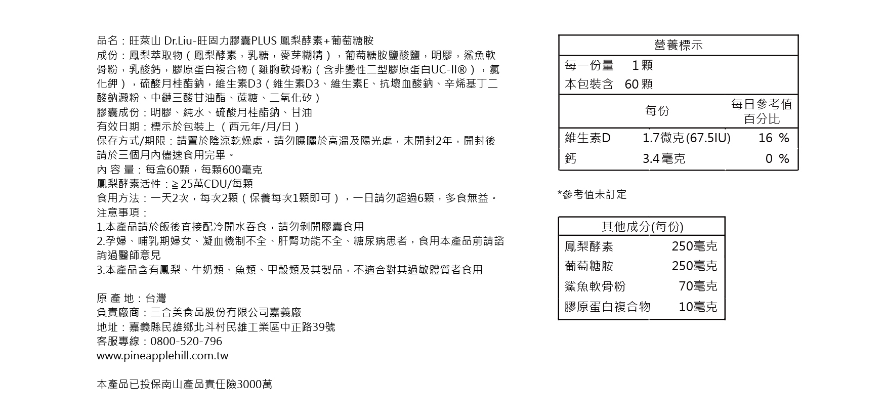 品名:旺萊山 Dr.Liu-旺固力膠囊PLUS 鳳梨酵素+葡萄糖胺