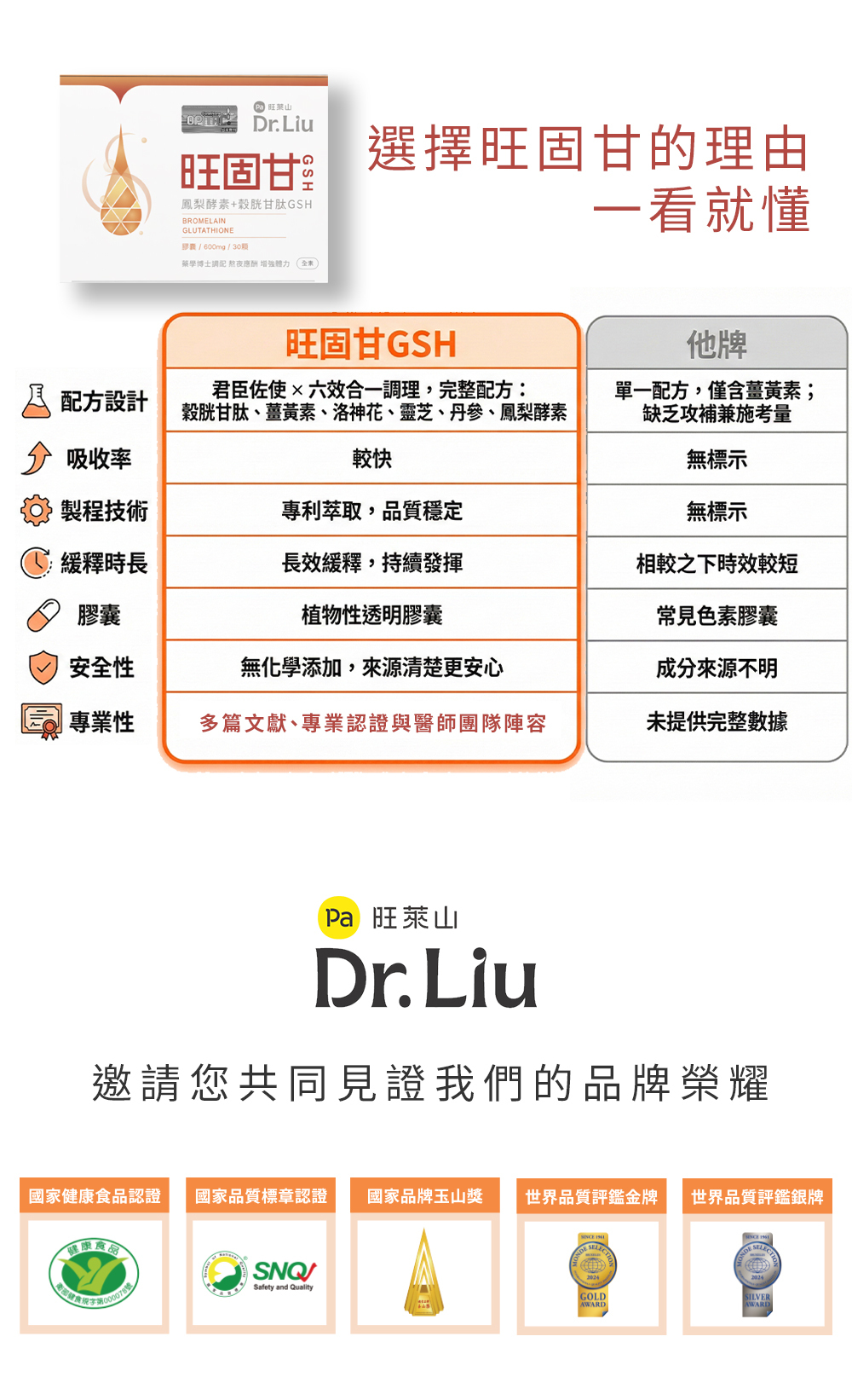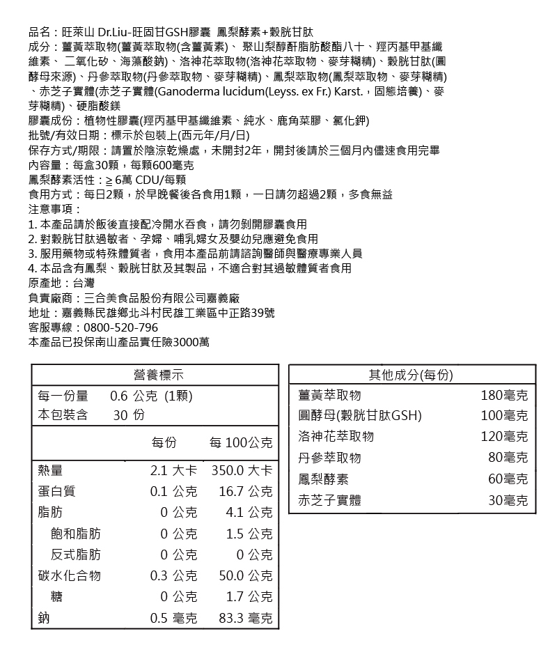 品名:旺萊山 Dr.Liu-旺固甘GSH膠囊  鳳梨酵素+穀胱甘肽