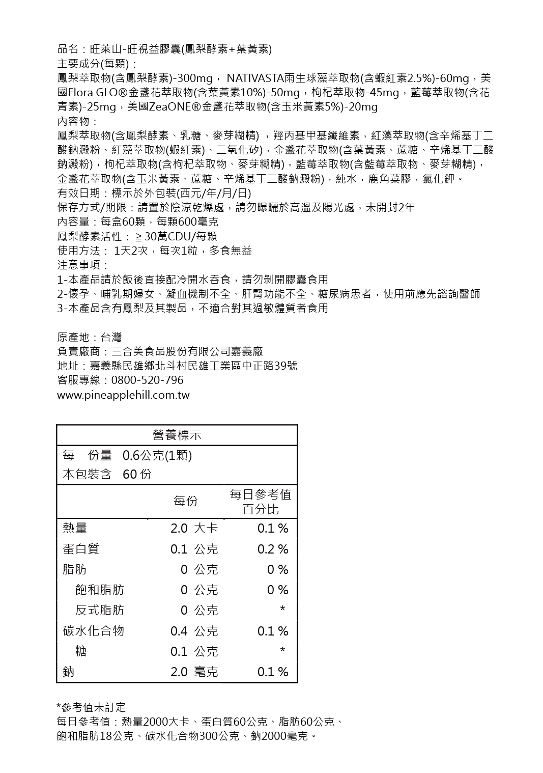 品名:旺萊山-旺視益膠囊(鳳梨酵素+葉黃素)