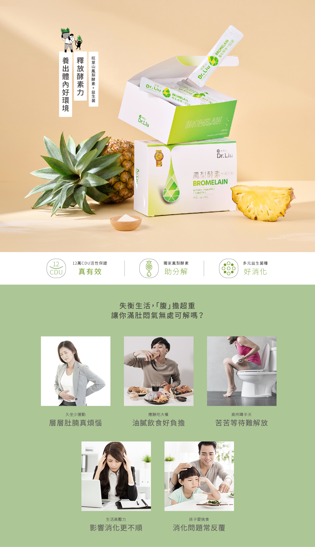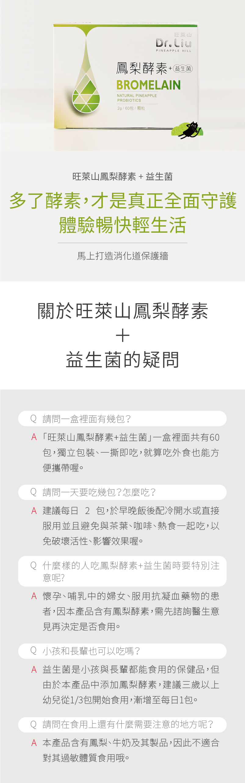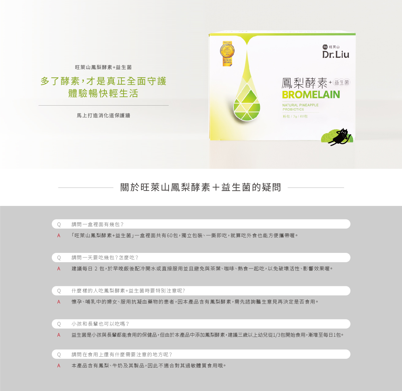 A:益生菌是小孩與長輩都能食用的保健品,但由於本產品中添加鳳梨酵素,建議三歲以上幼兒從1/3包開始食用,漸增至每日1包。