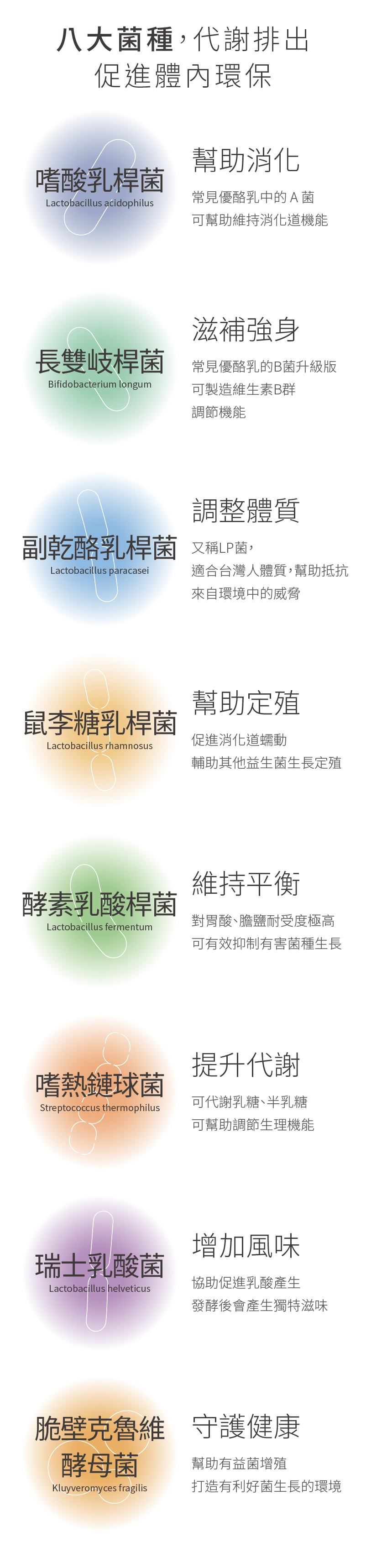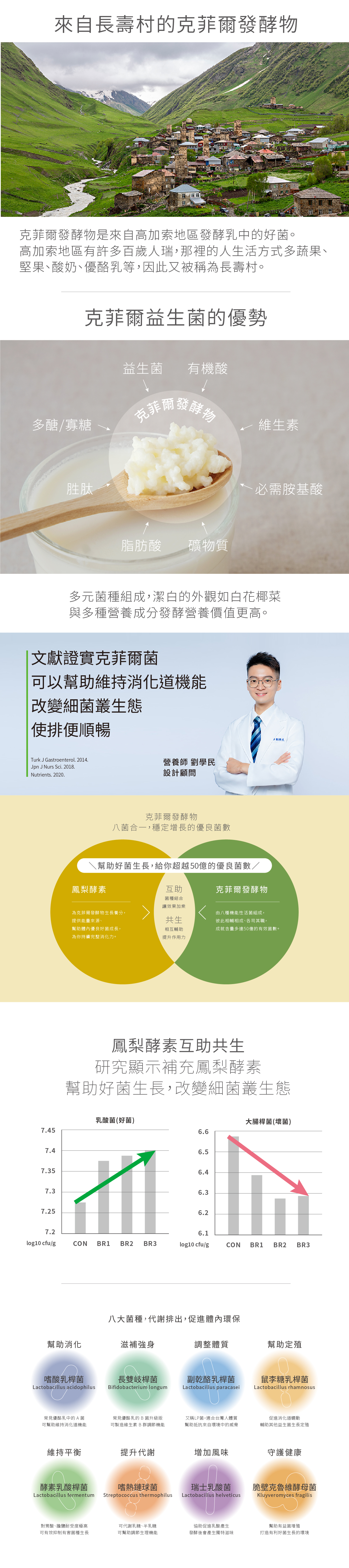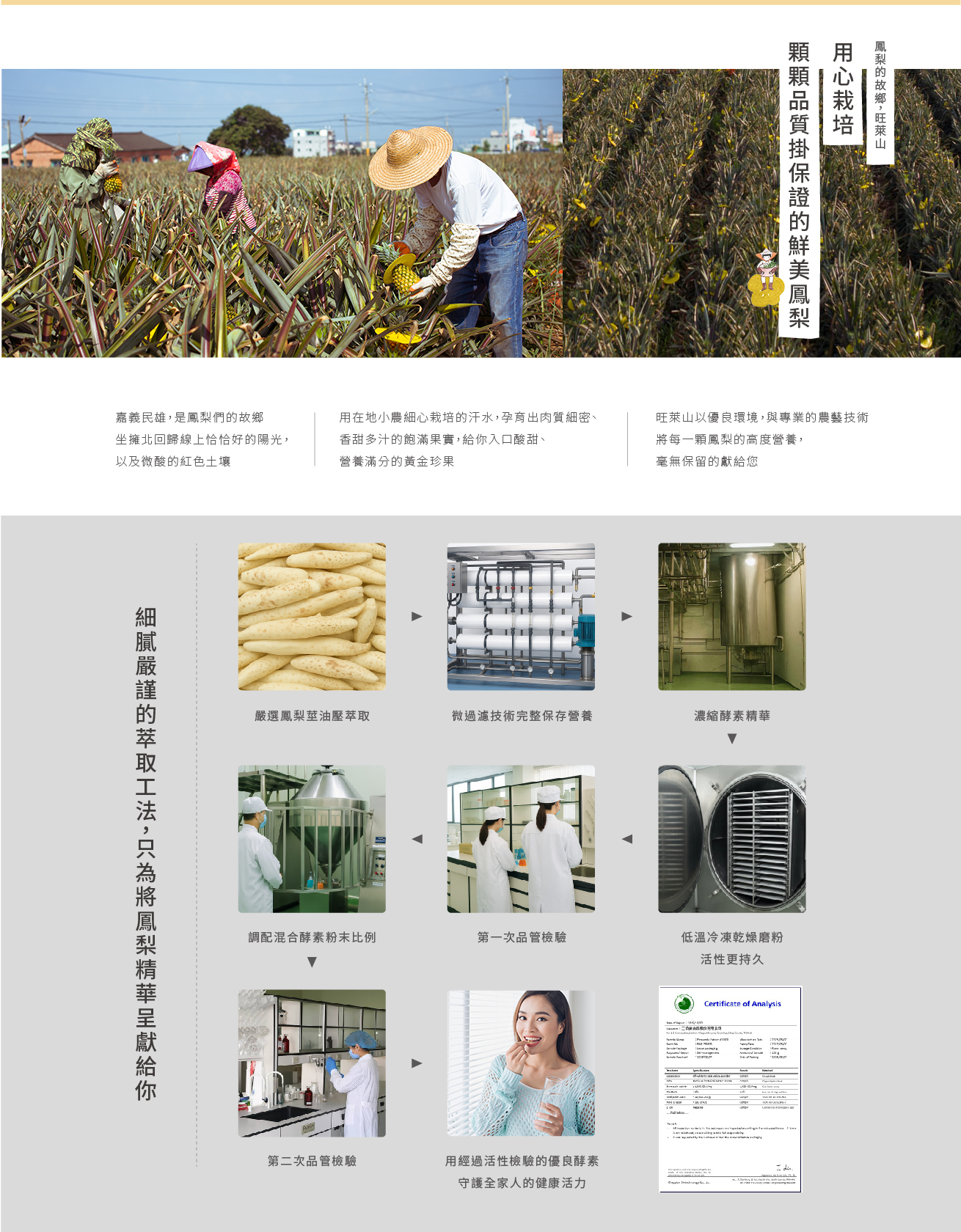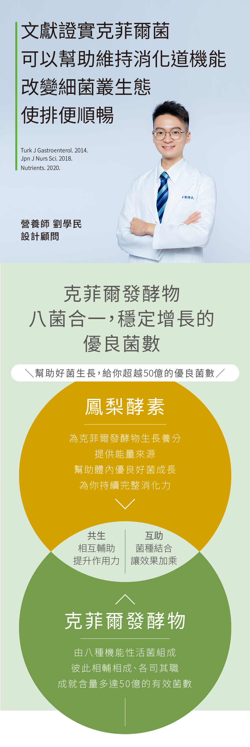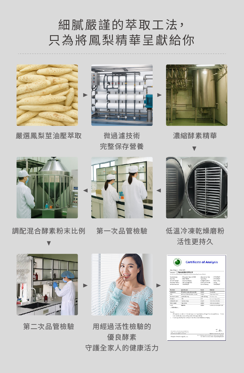 成分:鳳梨果汁粉(鳳梨果汁、麥芽糊精)、乳糖、鳳梨萃取物、克菲爾發酵物(含乳酸菌(Lactobacillus acidophilus、Bifidobacterium longum、Lactobacillus paracasei、Lactobacillus rhamnosus、Lactobacillus fermentum、Streptococcus thermophilus、 Lactobacillus helveticus 、 Kluyveromyces fragilis )、酵母菌)、麥芽糊精、微結晶纖維粉、寡糖