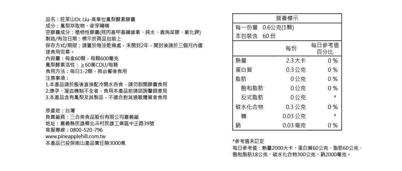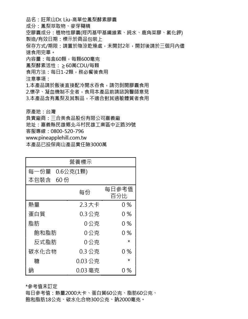 品名:旺萊山Dr. Liu-高單位鳳梨酵素膠囊