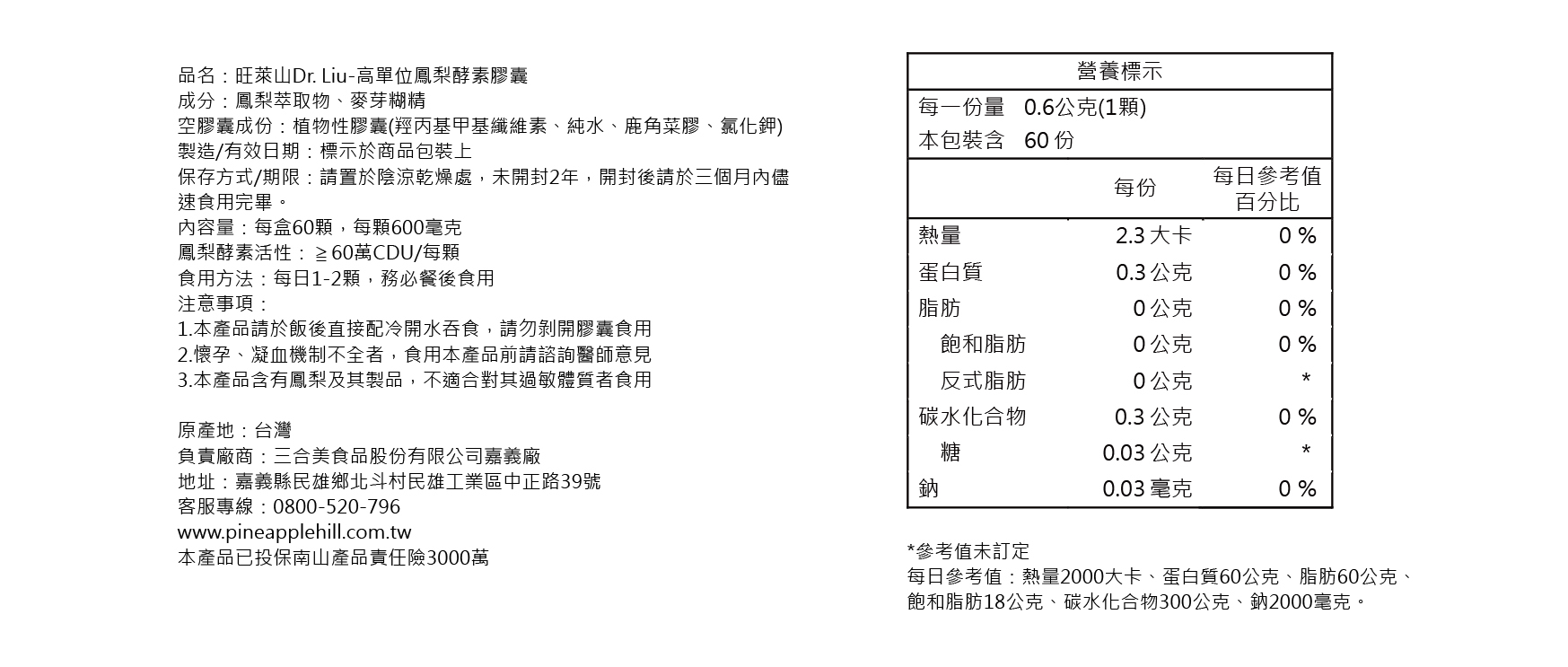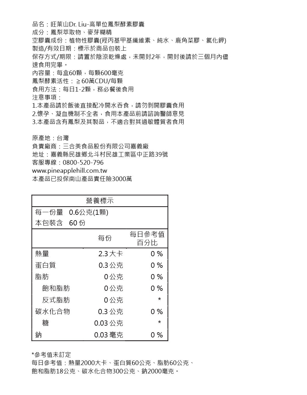 品名:旺萊山Dr. Liu-高單位鳳梨酵素膠囊