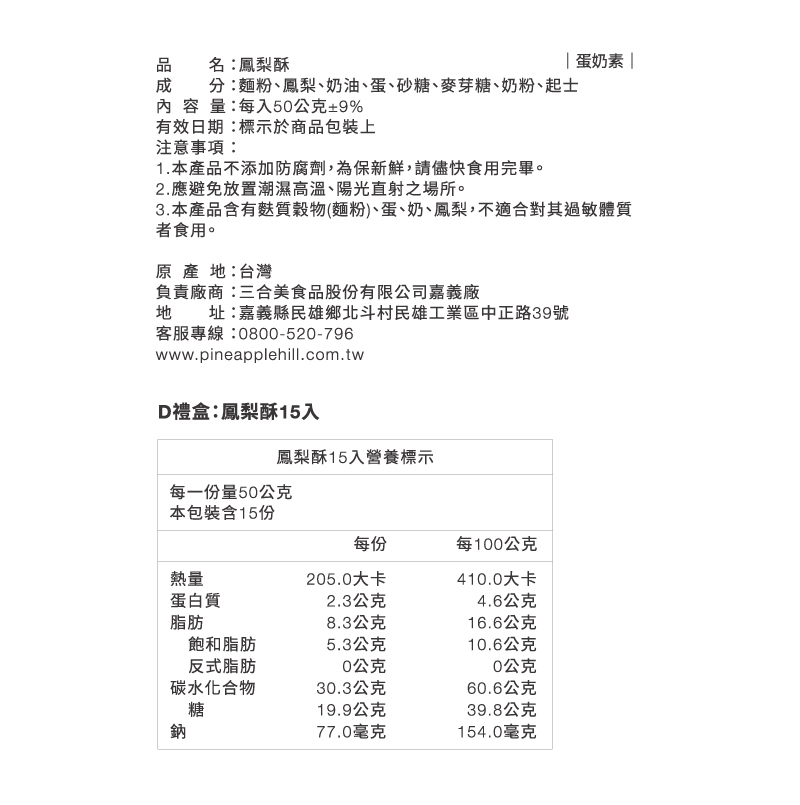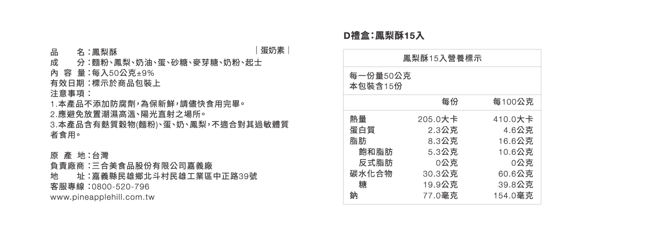 成分:麵粉、鳳梨、奶油、蛋、砂糖、麥芽糖、奶粉、起士