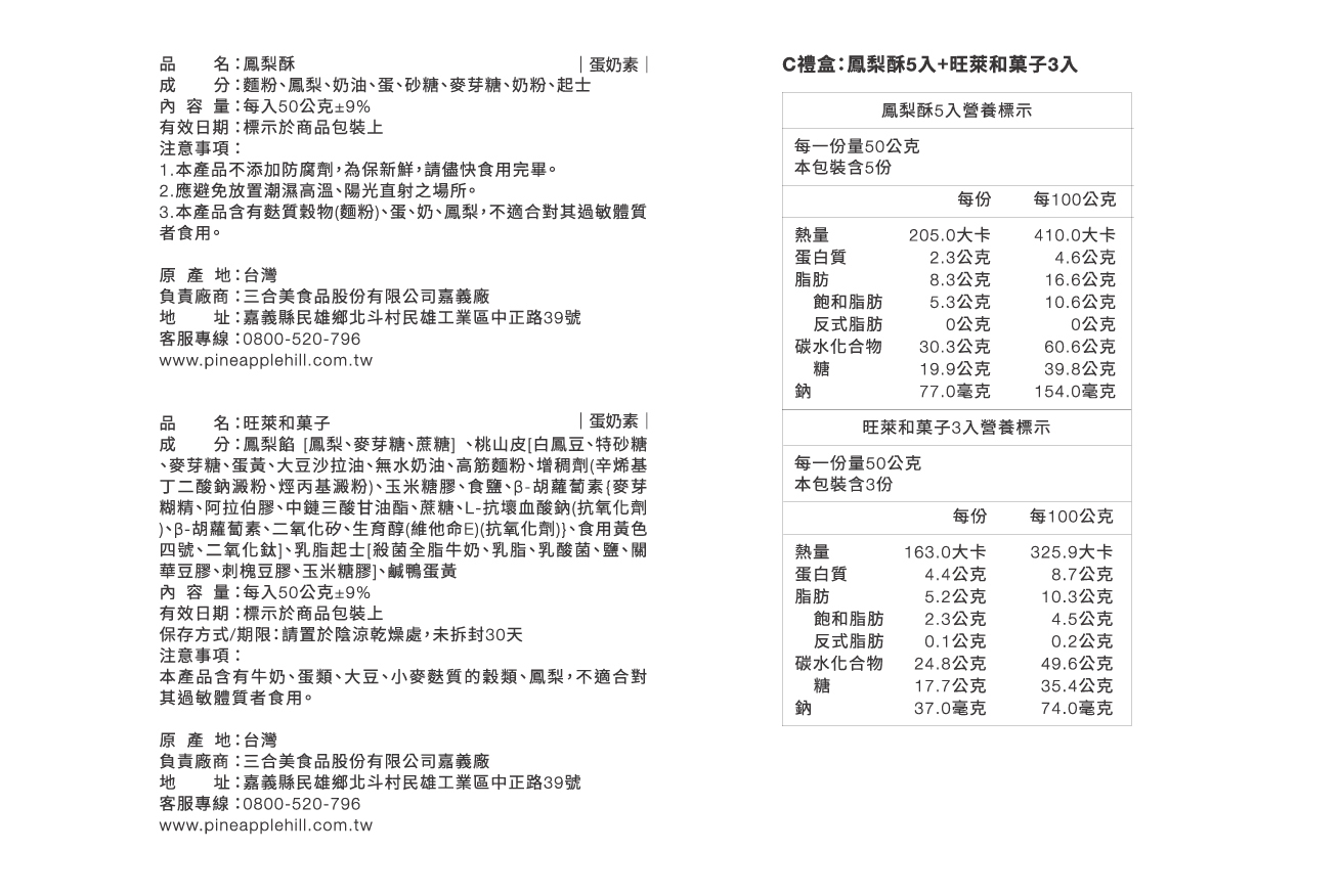 成分:麵粉、鳳梨、奶油、蛋、砂糖、麥芽糖、奶粉、起士