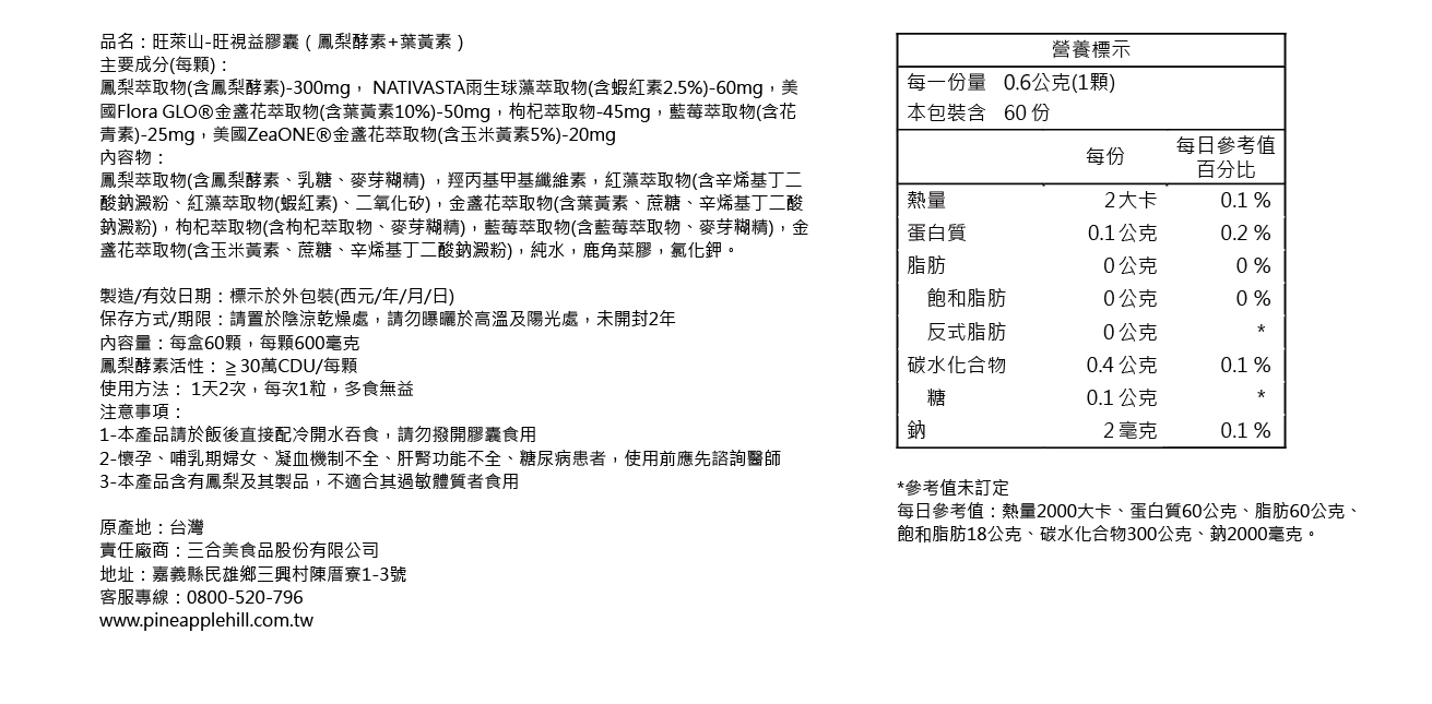 品名:旺萊山-旺視益膠囊(鳳梨酵素+葉黃素)